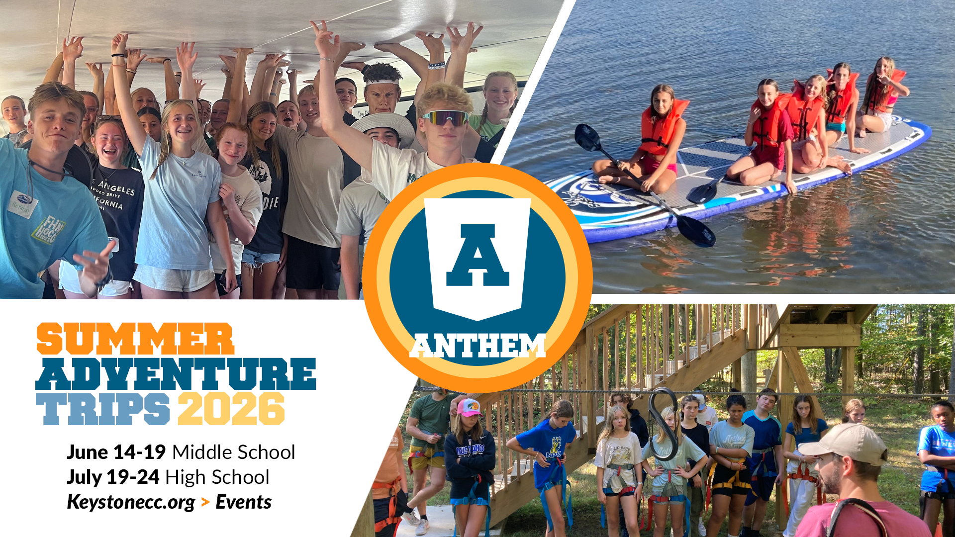 MIDDLE SCHOOL, JUNE 14-19 & HIGH SCHOOL, JULY 19-24 Anthem students are mixing it up this summer and doing adventure trips! Picture "summer in Michigan" things like camping, hiking, biking and water activities. To sign up click either Middle or High school above.